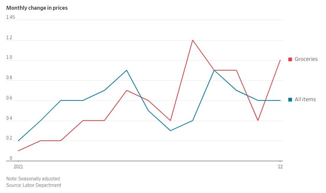 As pointed out in the chart above, while other consumer goods, including used cars, travel related expenses, and energy drove inflation during 2021, groceries began to outpace and ultimately drive inflation increases in the last 60 days.
